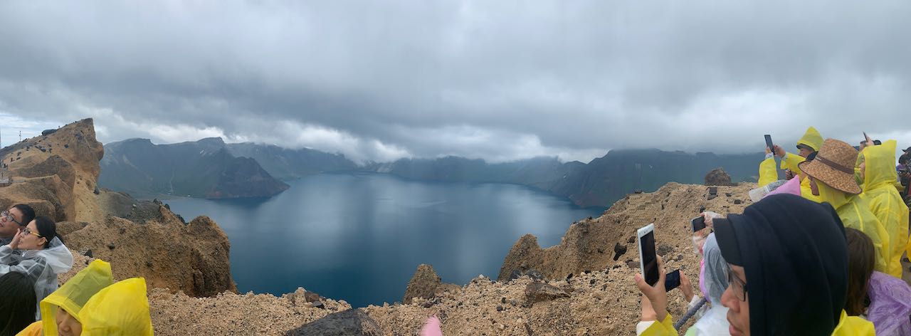 上面的天氣千變萬化,上一秒還晴空萬里,下一秒就烏雲密布,我在這就遇到了:上山前還晴空萬里,接近天池的時候突然下起雨來,快爬到觀景台的時候,陣雨馬上就停了,真是運氣不錯。朋友形容天池就是個大水泡(很大的水坑),我覺得他講的也沒錯啦!近距離看感覺非常壯觀,我想每個人應該跟我一樣,親眼目睹天池覺得很壯觀,也覺得很激動,唯一能做的就是拿著手機用力的紀錄,因為下回不知道時候能再來,即便來了也不知道能不能這麼幸運。